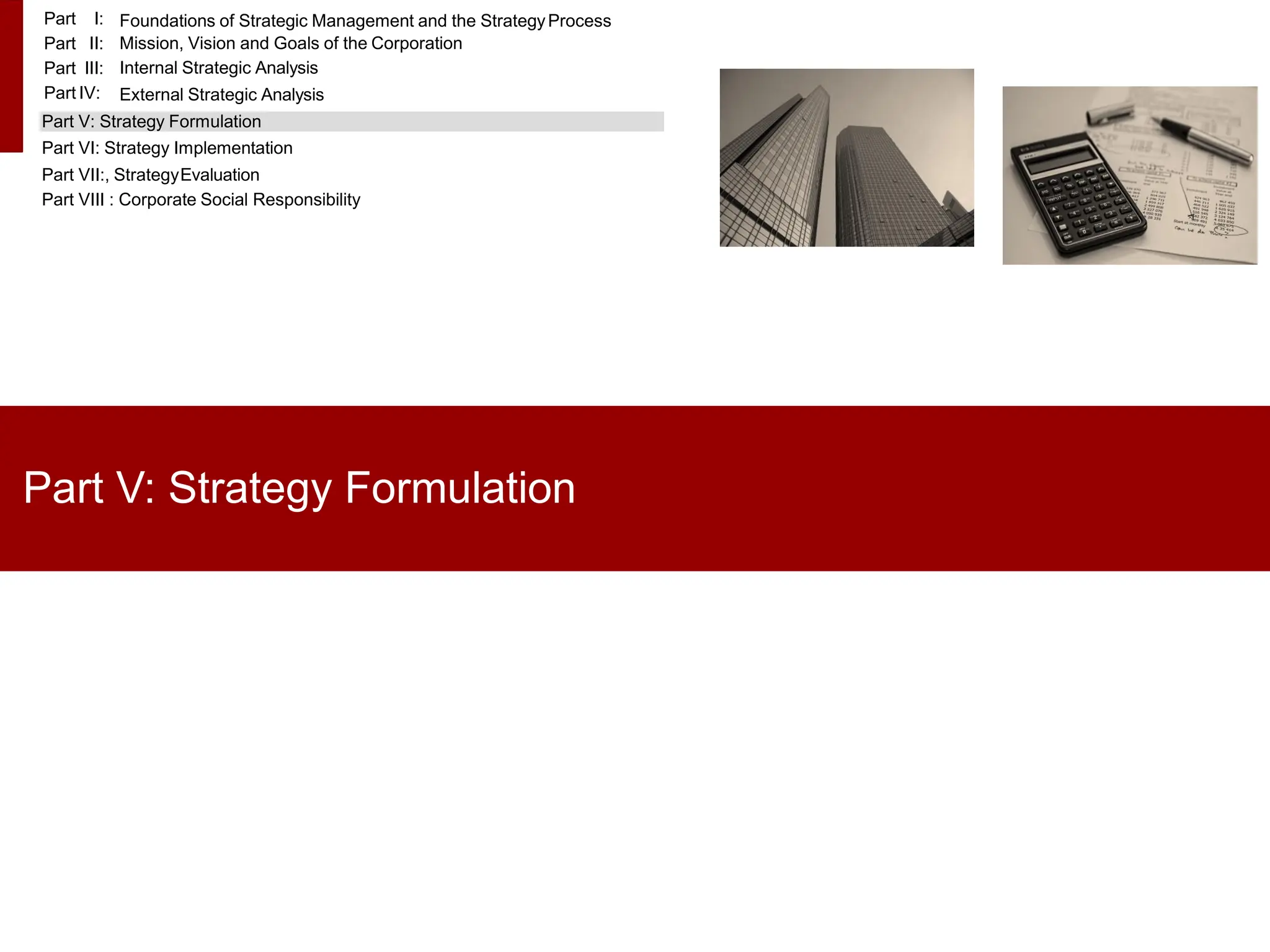 The document covers various aspects of strategic management, focusing on strategy formulation, implementation, and evaluation. It discusses different levels of strategies (corporate, business, and functional) and various growth strategies such as vertical and horizontal integration, as well as diversification. Additionally, it emphasizes the importance of portfolio analysis and offers insights into mergers, acquisitions, and joint ventures as means for achieving strategic competitiveness and improving profitability.