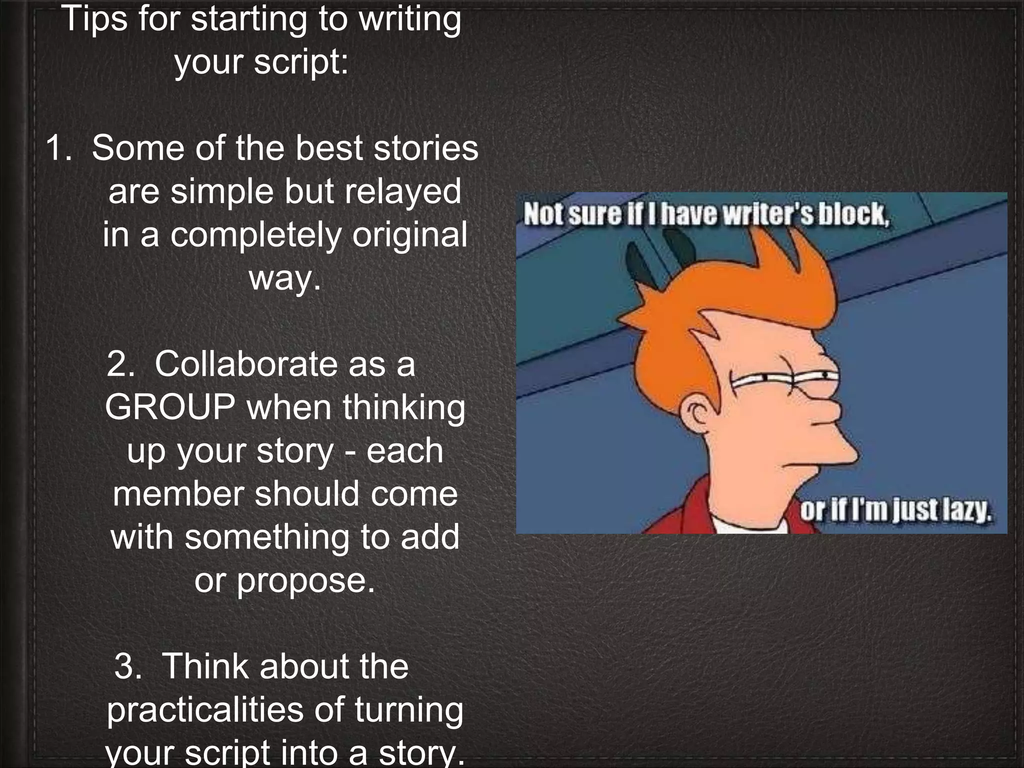 This document provides tips and guidelines for writing scripts and creating storyboards. It emphasizes keeping scripts simple but original, collaborating with a group, and considering practical filming aspects. Scripts are living documents that can be edited based on filming. Storyboards help visualize shots and ensure a smooth shoot by planning shot progression and eliminating confusion. Examples of a script and storyboard are included to illustrate their purposes and components.