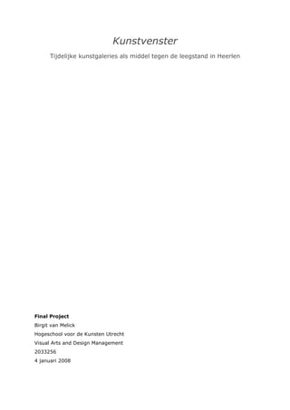 Onderzoek naar in hoeverre het galerieplan van kunstenaar Michel Huisman werkbaar en implementeerbaar is in het licht van het gemeentelijke beleid Heerlen, de creatieve industrie en de betrokken partijen. Afgestudeerd met een 8,5.