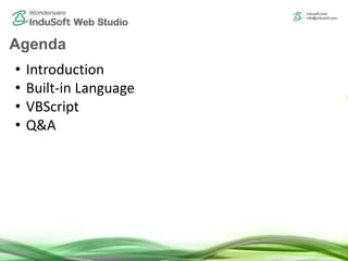 The document provides an overview of InduSoft Web Studio (IWS), a configuration interface for data communication, manipulation, and presentation, highlighting its scripting capabilities with built-in languages like VBScript. It details the functionalities, syntax, and debugging tools available for both built-in languages and VBScript, followed by information on data access functions and support. Additionally, it offers contact information for InduSoft support across multiple countries.