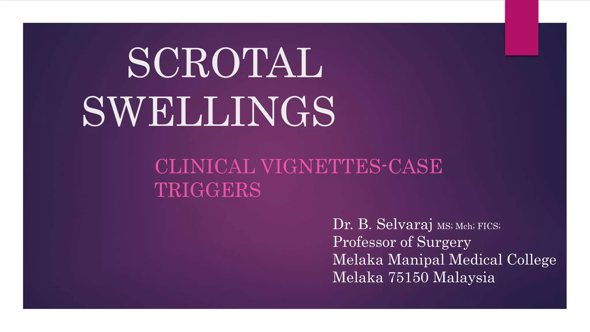 The document presents a series of clinical vignettes focusing on various types of scrotal swellings in male patients, detailing patient histories, observations, and differential diagnoses. Each case includes specific questions regarding diagnostics, management, and complications, emphasizing the importance of understanding the underlying conditions. The teaching aims to enhance clinical reasoning and surgical decision-making regarding scrotal swelling presentations.