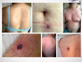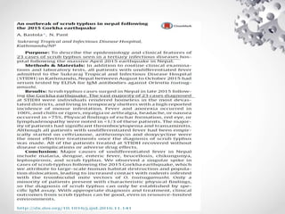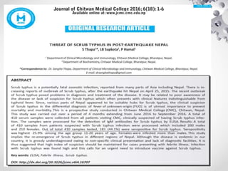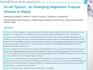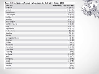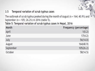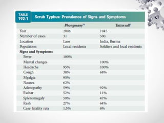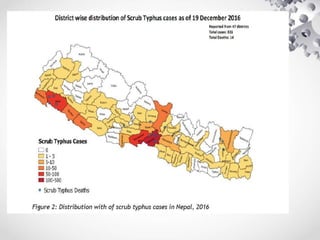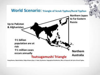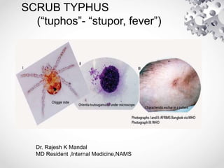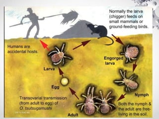 Scrub typhus is caused by the bacteria Orientia tsutsugamushi, which is transmitted through the bites of infected trombiculid mites. It causes an acute febrile illness with symptoms such as fever, headache, and rash. If left untreated, it can lead to complications affecting multiple organs and the case fatality rate is 7%. Diagnosis is made through serologic tests detecting antibodies or PCR detecting bacterial DNA. Treatment involves doxycycline or azithromycin antibiotics, with fever typically resolving within 1-2 days. Prevention involves wearing protective clothing, using insect repellent, and clearing vegetation to limit mite habitats.