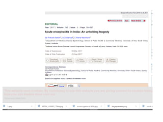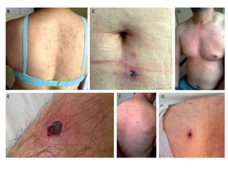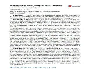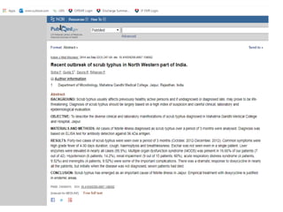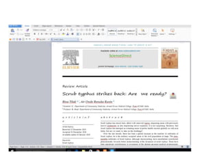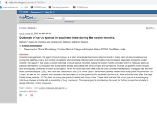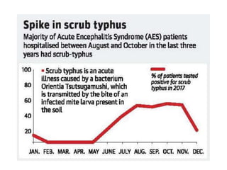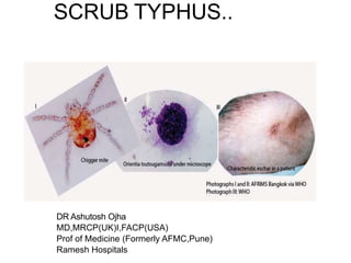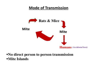 Scrub typhus is a mite-borne infectious disease caused by the bacteria Orientia tsutsugamushi. It is transmitted through the bites of larval trombiculid mites. The disease is characterized by high fever, headache, rash and commonly develops an eschar at the site of the mite bite. Complications can include pneumonia, acute respiratory distress syndrome, meningitis and multi-organ failure. Diagnosis is usually made through serologic testing like immunofluorescence assay, which detects IgM and IgG antibodies. Treatment involves doxycycline or azithromycin which is generally effective. Scrub typhus is endemic in parts of Asia and can cause fatalities if left untreated.