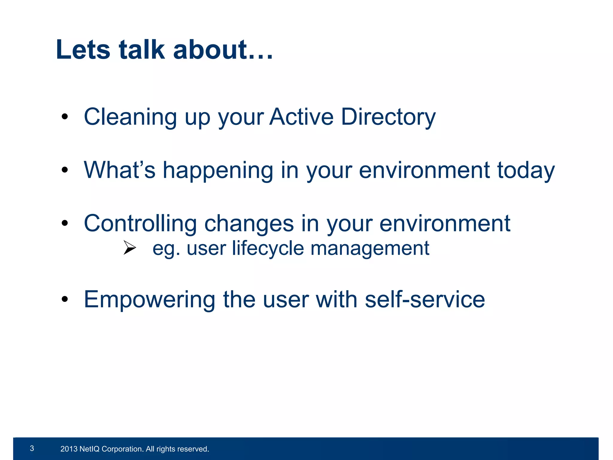 The document discusses the importance of cleaning up Active Directory environments to mitigate risks associated with inactive and unmanaged accounts, emphasizing the need for automated cleanup processes to enhance security and compliance. It highlights challenges faced by organizations in managing user accounts and the necessity of effective user lifecycle management as well as self-service options for users. Additionally, it notes the significance of adhering to regulatory standards and improving user empowerment through self-service password management.