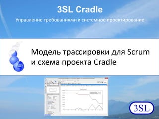 Документ описывает модель трассировки для методологии Scrum и инструмент Cradle для управления требованиями и системного проектирования. Он подчеркивает возможность интеграции с Scrum без необходимости изучения нового инструмента и предлагает структурированные схемы для управления проектами. Также представлены разнообразные атрибуты и связи для эффективного управления задачами и релизами.