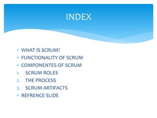This document discusses the Scrum framework. Scrum is an agile process for managing complex product development. It uses self-organizing cross-functional teams, sprints, daily stand-ups, and artifacts like a product backlog and sprint backlog. The key components of Scrum include roles like the Scrum Master, Product Owner, and Scrum Team. The Scrum process involves sprint planning, daily stand-ups, and producing an increment of work each sprint.