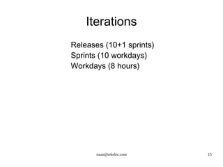 The document summarizes how a software company implemented Scrum and lean principles to improve coordination, manage requirements, and deliver releases on time. Some key problems previously were difficulty coordinating distributed teams of 1000 staff and delays in major releases. The company adapted Scrum, with roles like Product Owner and Scrum Master, along with XP practices like pair programming. This allowed parallel development across teams and on-time delivery of 2.6 and 3.0 releases through 10+1 sprints and daily stand-up meetings.