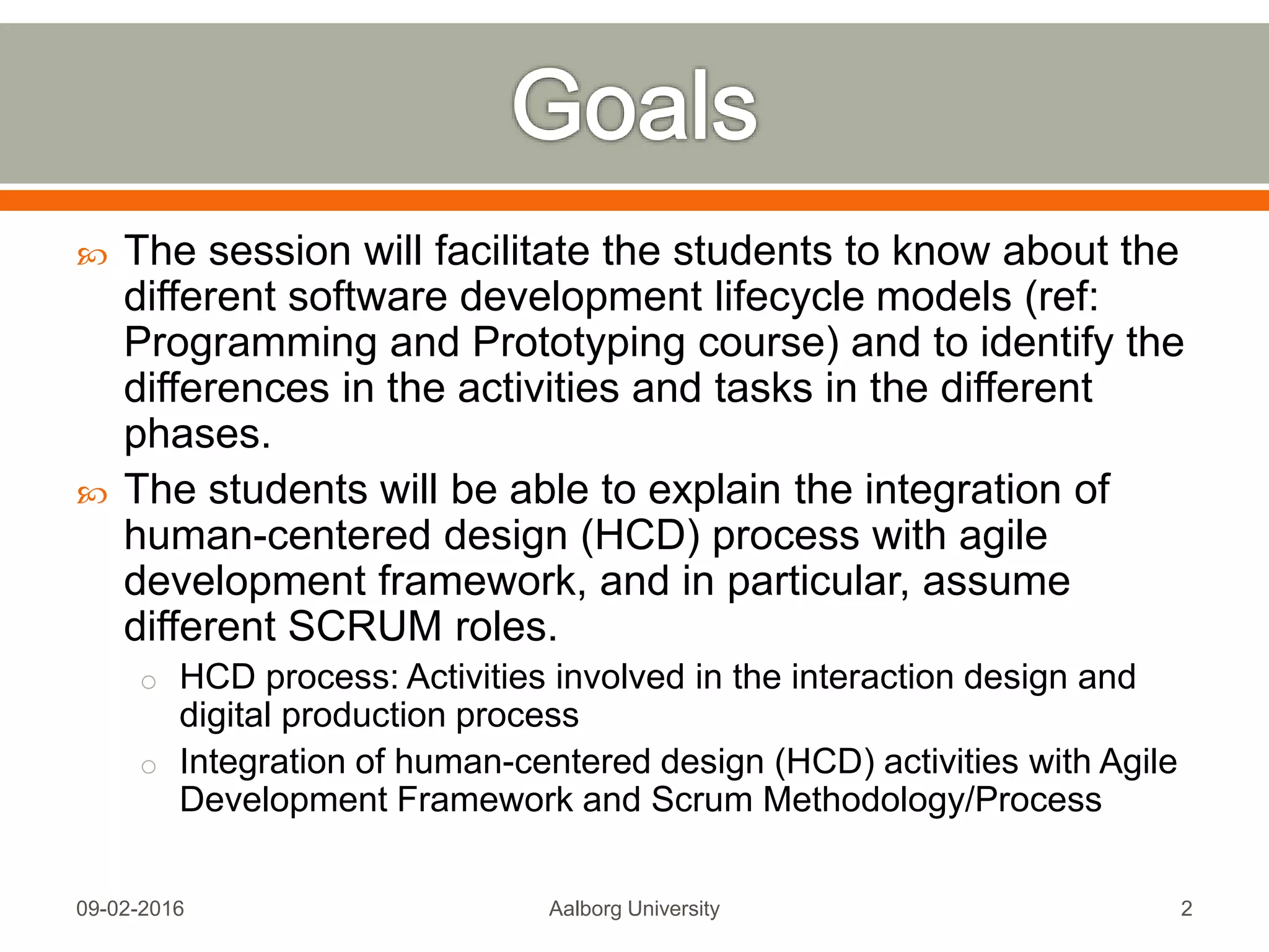 This document discusses integrating human-centered design processes with agile software development frameworks, specifically Scrum. It begins by outlining the key activities in human-centered design according to ISO standards: establishing requirements, designing alternatives, prototyping designs, and evaluating the user experience. It then explains how these activities can be mapped to Scrum roles, ceremonies, and artifacts. Specifically, it discusses conducting user research upfront to inform product backlog items, using prototyping techniques during sprints to refine designs, and holding sprint reviews and retrospectives to evaluate the user experience. The document provides an overview of Scrum roles, ceremonies, and artifacts to illustrate how human-centered design fits within the Scrum process.