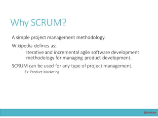 The document outlines the essentials of utilizing Scrum as a project management methodology, highlighting its iterative and incremental approach suitable for software development. It emphasizes using best practices and adapting Scrum principles for varying project sizes, particularly for small teams. Key concepts include roles, meetings, and definitions like the Definition of Done (DoD), along with useful project management tools.