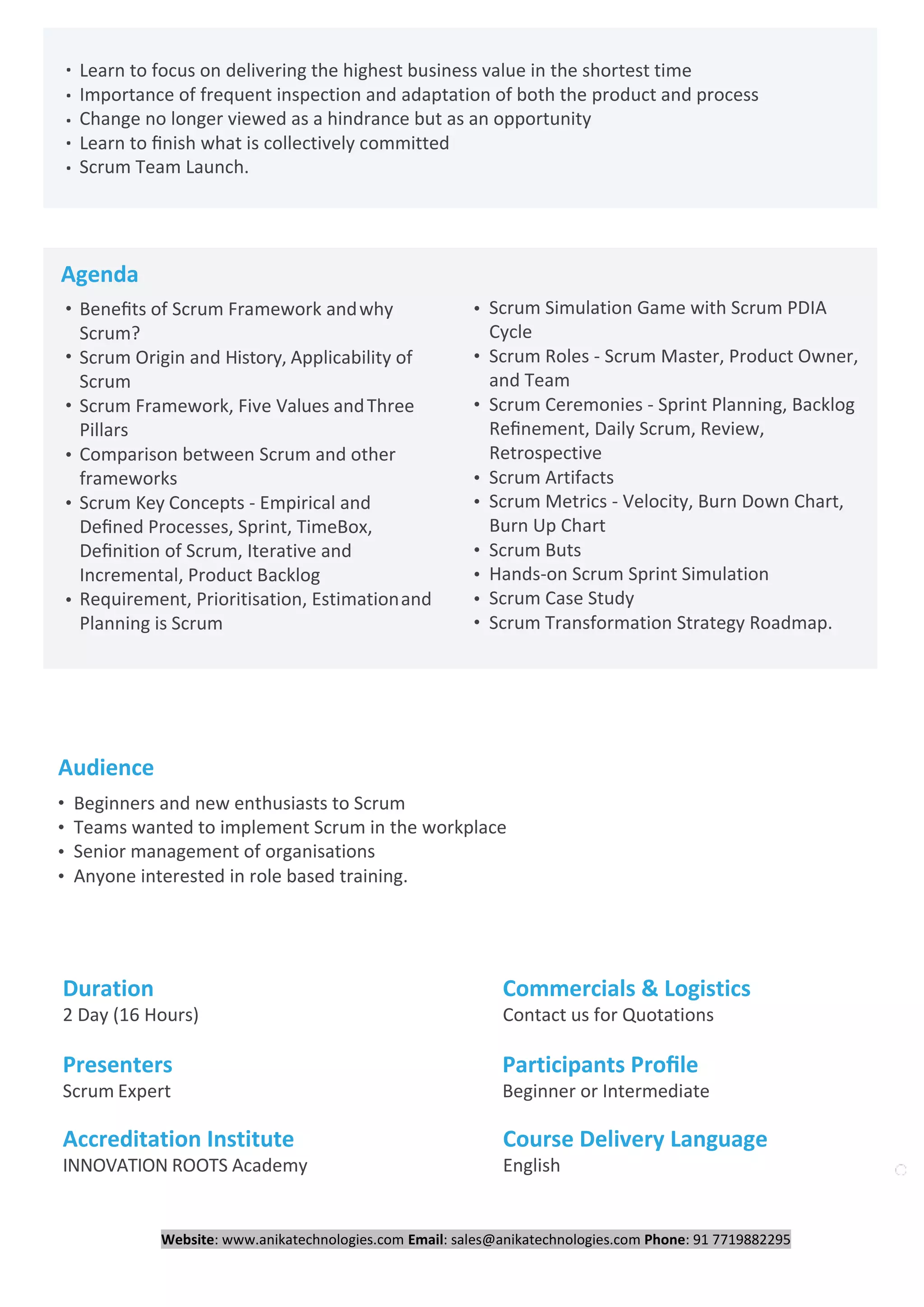 The document outlines the Scrum Foundation Training offered by Anika Technologies, aimed at enhancing team effectiveness through understanding the Scrum framework. Participants will learn core values, roles, and practices of Scrum and gain practical knowledge to implement it in their projects, resulting in improved business outcomes. The workshop lasts two days and provides a certification upon completion, suited for beginners and those interested in Agile practices.