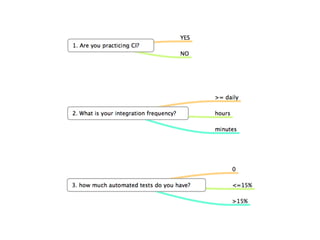 Continuous Integration from Ground to Cloud discusses the challenges of CI and how moving to cloud-based CI can help address them. The document outlines challenges such as people resisting change, slow builds, and lack of testing. It then provides solutions like demonstrating benefits, optimizing code and builds, and starting with smoke tests. Moving CI to the cloud can improve resource utilization, reduce maintenance overhead, and make parallel and multiple environment builds and tests easier. Some concerns are potential speed issues, technical constraints, and security policy conflicts.
