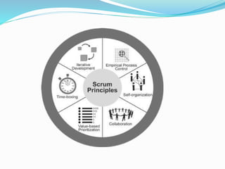 The document outlines the core philosophy of Scrum, emphasizing transparency, inspection, and adaptation as key principles for enhancing team self-organization and ownership. It highlights the Scrum framework's focus on delivering maximum business value in minimal time, utilizing value-based prioritization and time-boxing to improve efficiency and manage changes effectively. The three dimensions of collaborative work—awareness, articulation, and appropriation—are also noted as beneficial for minimizing change requests and fostering continuous improvement.