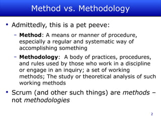 Scrum is an agile process for managing software development projects using empirical process control with inspection and adaptation cycles. The scrum process consists of monthly sprints resulting in potentially shippable increments and daily scrum meetings. A product backlog is prioritized and items are selected for each sprint backlog. The scrum team works during sprints to complete items and demonstrate progress at sprint reviews.