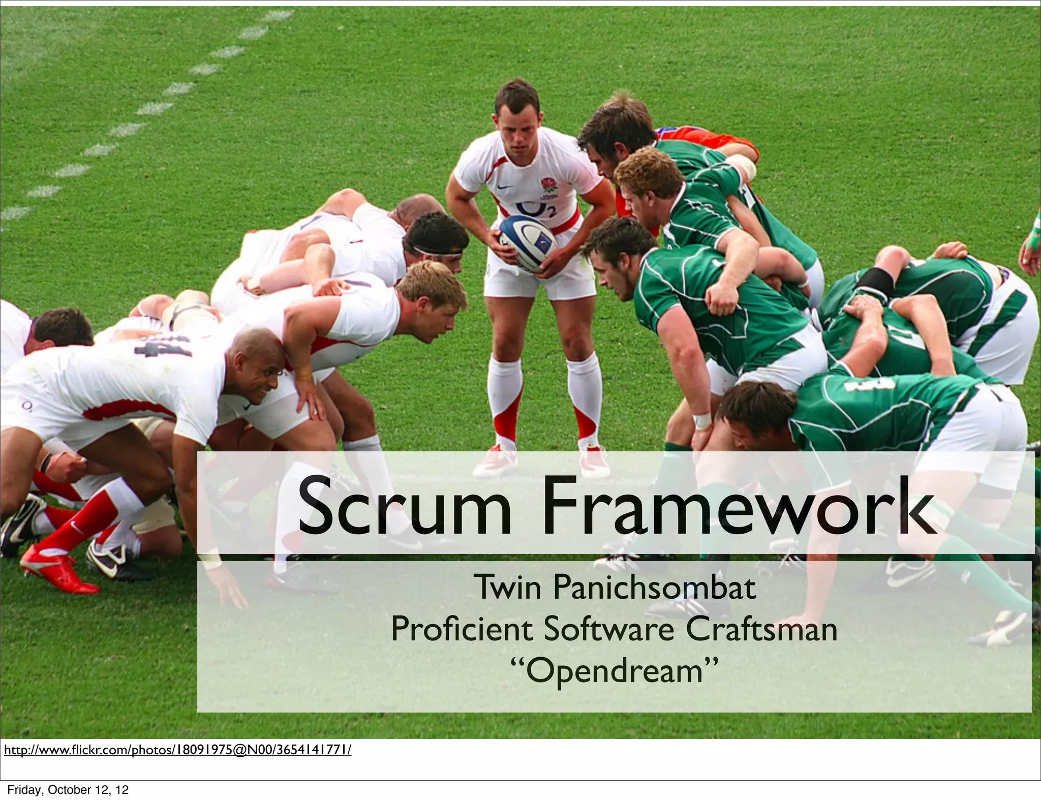 The document discusses the Scrum framework, an agile methodology for managing projects. It describes Scrum roles like the Product Owner and Scrum Master, activities in the Scrum process like sprint planning and daily stand-ups, and artifacts like the product backlog, sprint backlog, and burn down chart. The document provides images to illustrate Scrum concepts and practices for delivering working software in short, timed iterations.