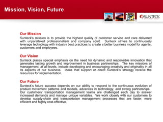 Sunteck Transport Group is a transportation and logistics company that focuses on providing high quality customer service. Their mission is to leverage technology and industry best practices to create an efficient business model. Partnering with Sunteck provides access to their large carrier network and superior service to meet evolving supply chain needs. They have a strong management team and have experienced steady financial growth in recent years.