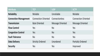 SCTP is a transport layer protocol that provides reliable transmission of data streams over connectionless networks. It supports multi-homing by allowing endpoints to connect over multiple IP addresses, allowing fault tolerance by switching connections if one path fails. SCTP establishes connections using a four-way handshake and supports ordered and unordered delivery of data chunks. It uses sequence numbers, acknowledgments, and retransmissions to ensure reliable and error-free data transfer. Flow control is implemented using a receiver window and congestion control uses mechanisms similar to TCP.