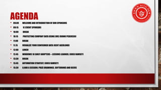 This document contains the agenda for a user group event on system and configuration management. The agenda includes presentations on protecting company data using encryption, visualizing configuration manager data, lessons learned from early Windows 10 adoption, and automation strategies. There will also be sponsor presentations, breaks, lunch, a Q&A session and prize drawings. The user group aims to share knowledge in a non-profit community. Upcoming events focus on server/data center and client/mobile management. A new webmaster is welcomed and practical information is provided.