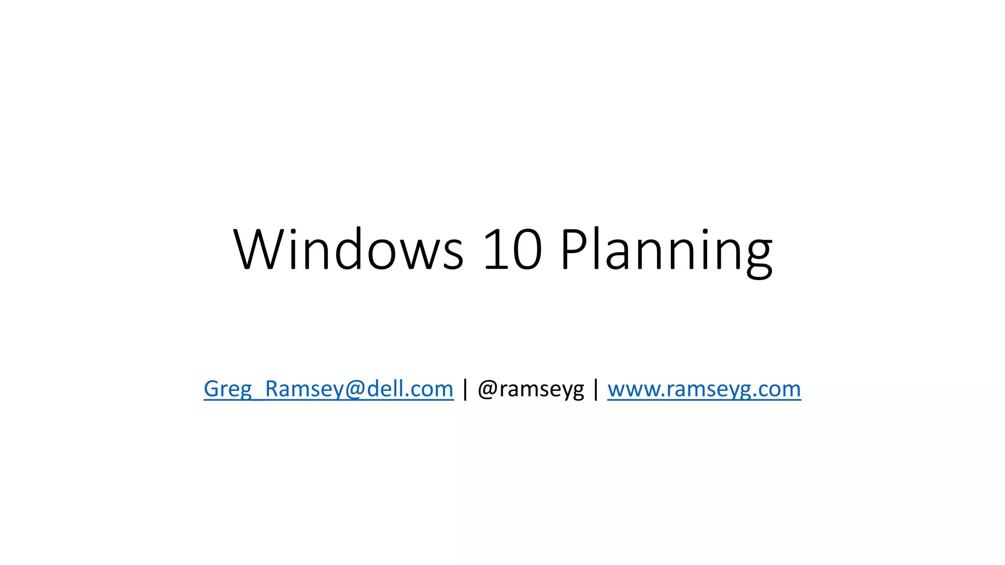 This document summarizes planning considerations for deploying Windows 10 in an enterprise environment. It discusses enabling Enterprise Mode IE 11 compatibility, Group Policy settings to manage OneDrive sync and Windows customization, ensuring UEFI Secure Boot is enabled, challenges with Secure Boot for operating system deployment, and options for deploying modern applications including the Software Center, Application Catalog, and Company Portal. The document provides an overview of key upgrade and deployment topics to facilitate a smooth transition to Windows 10.