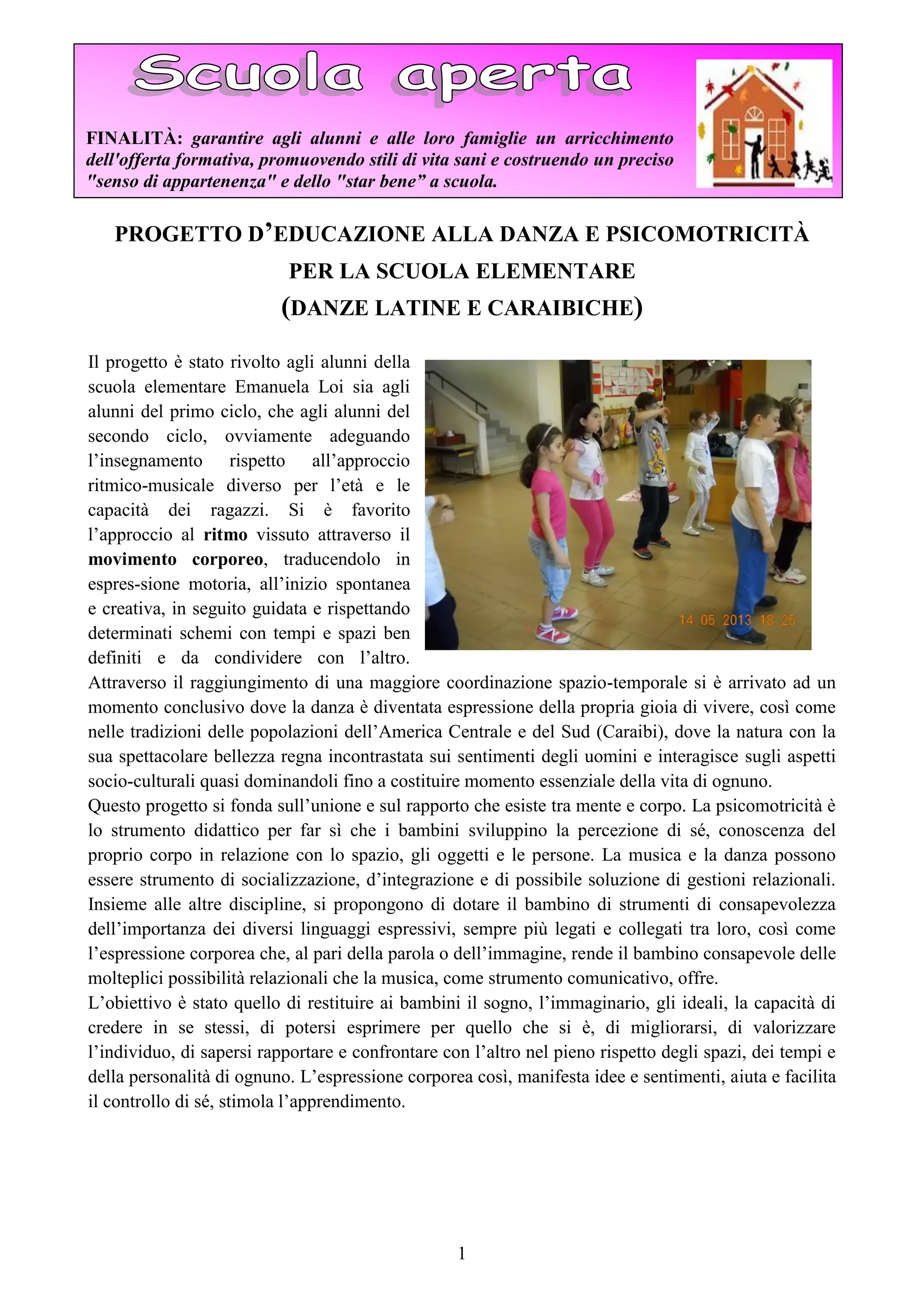 Il documento descrive due progetti educativi per la scuola elementare: uno dedicato alla danza e psicomotricità, volto a favorire l'espressione corporea e la coordinazione dei bambini, e l'altro un laboratorio di propedeutica musicale per l'apprendimento di strumenti come il flauto dolce e il pianoforte. Entrambi i progetti mirano a migliorare l'autoefficacia, la socializzazione e il senso di appartenenza degli alunni, promuovendo l'importanza della musica e del movimento. L'obiettivo finale è fornire ai bambini strumenti per esprimere emozioni e sviluppare relazioni rispettose e consapevoli.