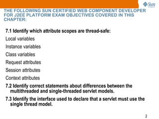 This document discusses thread safety in Java servlets, differentiating between local, instance, class, request, session, and context attributes. It explains the complexities of managing shared data in a multithreaded environment and highlights the importance of ensuring thread safety, particularly for instance and class variables. Additionally, it covers the use of the SingleThreadModel interface to limit access to a servlet, ensuring only one thread can access a servlet instance at a time.