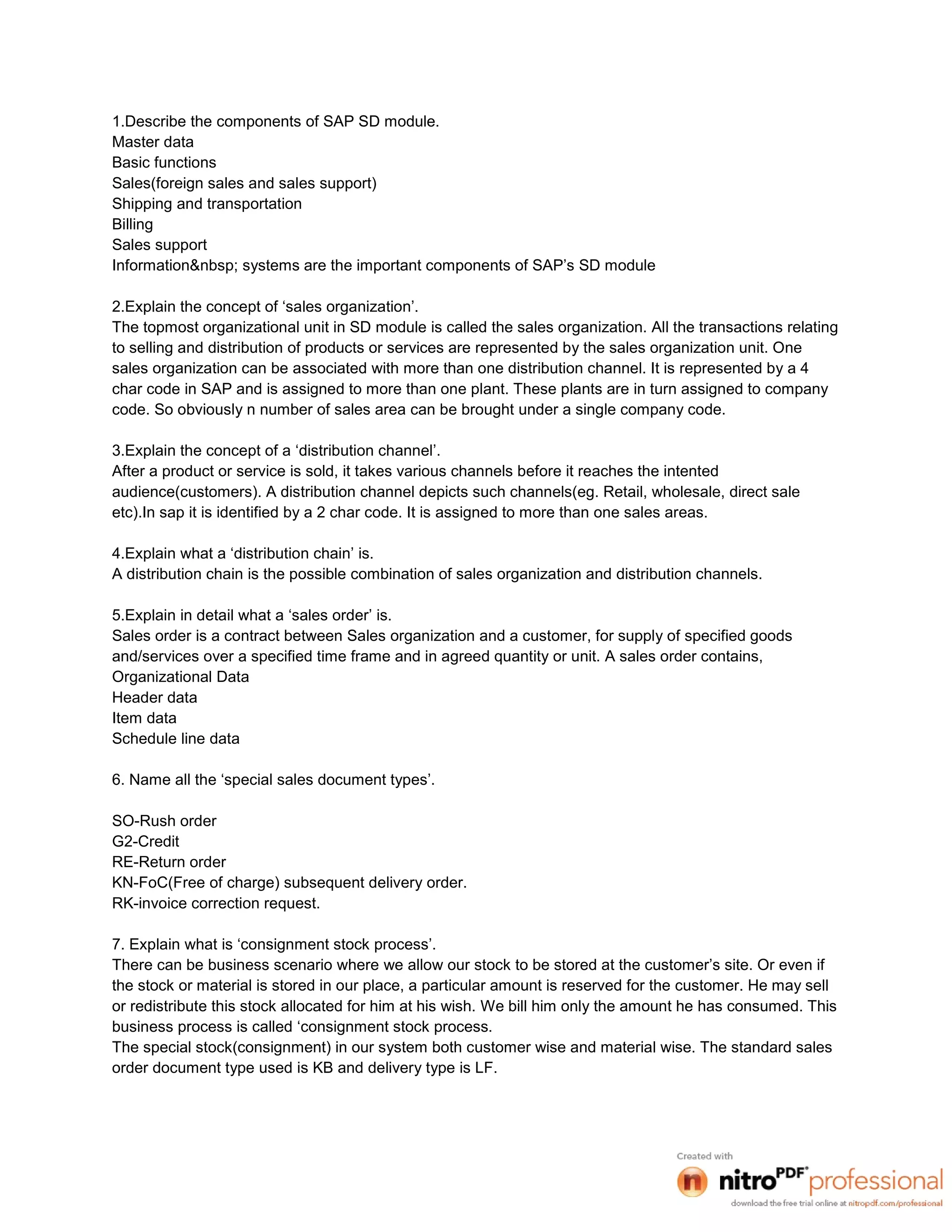 The key components of the SAP SD module include master data, basic functions, sales processes, shipping and transportation, billing, and sales support. A sales organization is the topmost organizational unit in SD and represents selling and distribution transactions. A distribution channel depicts the paths products take to reach customers after being sold. A distribution chain is a combination of a sales organization and distribution channels. A sales order is a contract between a sales organization and customer for supplying goods and services over a specified time frame and quantity. Special sales document types include rush orders, credit memos, return orders, and free of charge deliveries. The consignment stock process allows stock to be stored at a customer's site and billed only as consumed.