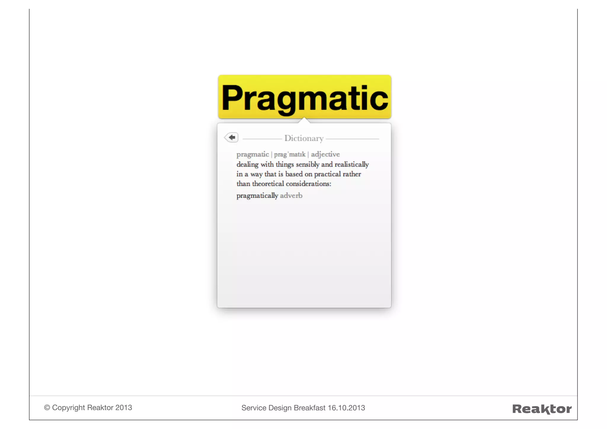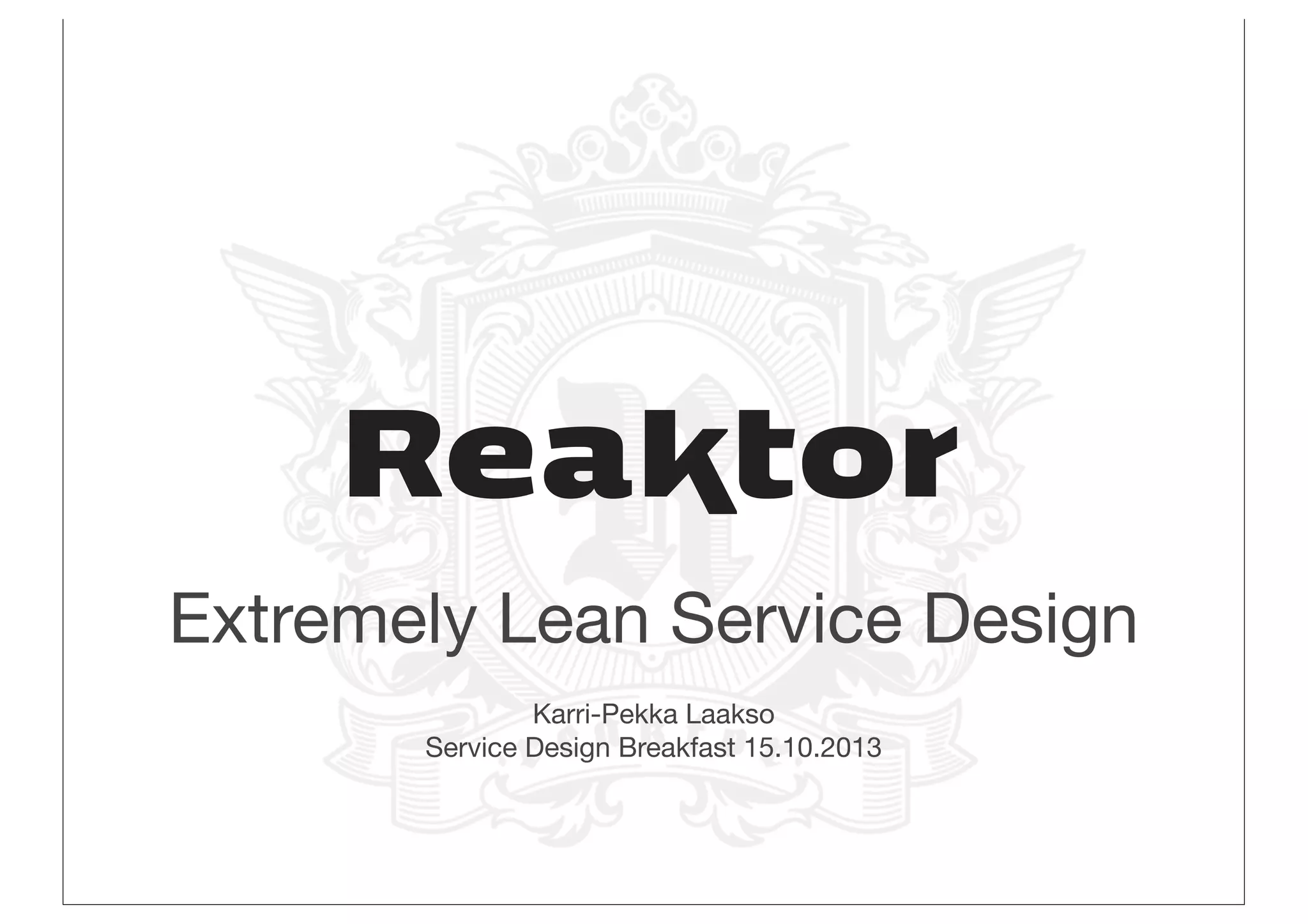 The document discusses the concept of service design presented at a breakfast event on October 16, 2013, by Karri-Pekka Laakso from Reaktor. It highlights themes around MVP (minimum viable product) and includes references to imagery and copyright notices. The content appears to be promotional or informative in nature related to service design methodologies.