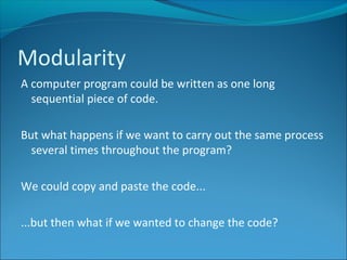 The document discusses modularity in computer programming. It explains that programs can be broken down into smaller subprograms or modules to make the code more manageable and reusable. This is done through procedures and functions, which are subroutines that can take parameters and be called throughout the program. Parameters allow information to be passed into subroutines. Subroutines can help reduce errors and duplication by encapsulating common tasks.