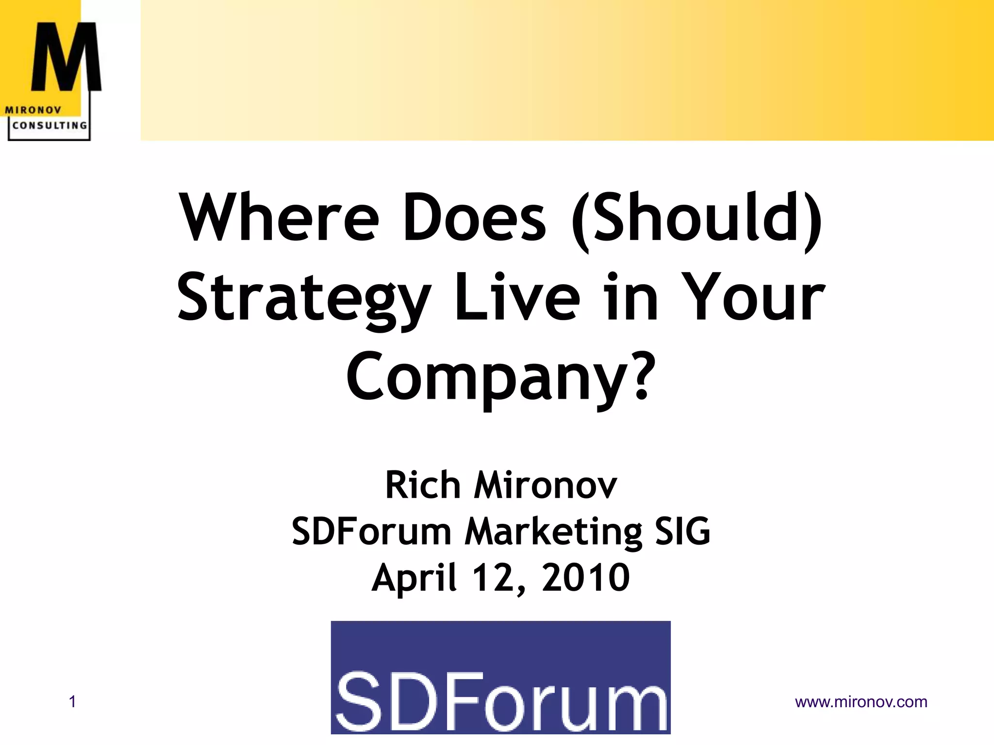 The document discusses the nature and location of strategy within different types of companies, emphasizing that strategy is an ongoing process requiring cross-functional collaboration and customer insights. It highlights common failures in startups and the importance of designating a product manager to own the strategy. The content outlines key strategic questions and methodologies for effective strategy formulation and execution in pre-revenue startups, small companies, and large corporations.