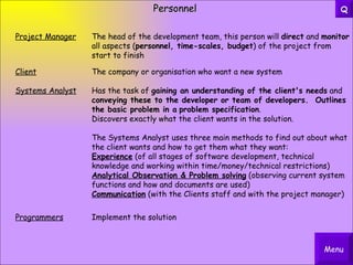 1) The project manager directs and monitors all aspects of the project. Systems analysts understand client needs and convey them to developers. Programmers implement the solution.
