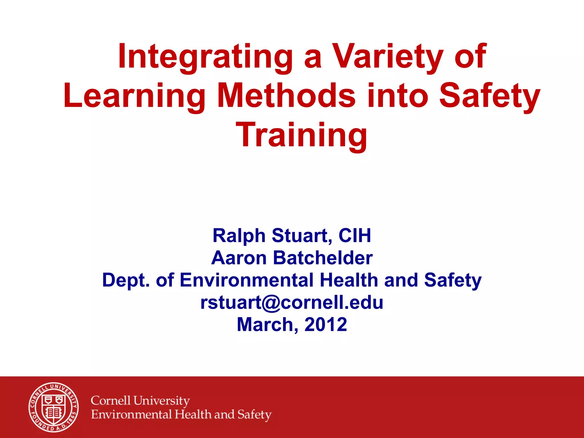 This document proposes integrating a variety of learning methods into safety training based on adult learning principles. It describes a systems approach to conceptualizing the many interrelated factors that influence lab safety. An example training program is outlined that uses a hands-on format addressing the key aspects of recognizing hazards, assessing risks, managing hazards, and preparing for emergencies (the RAMP model). References are provided on systems analysis concepts and specific safety training resources.
