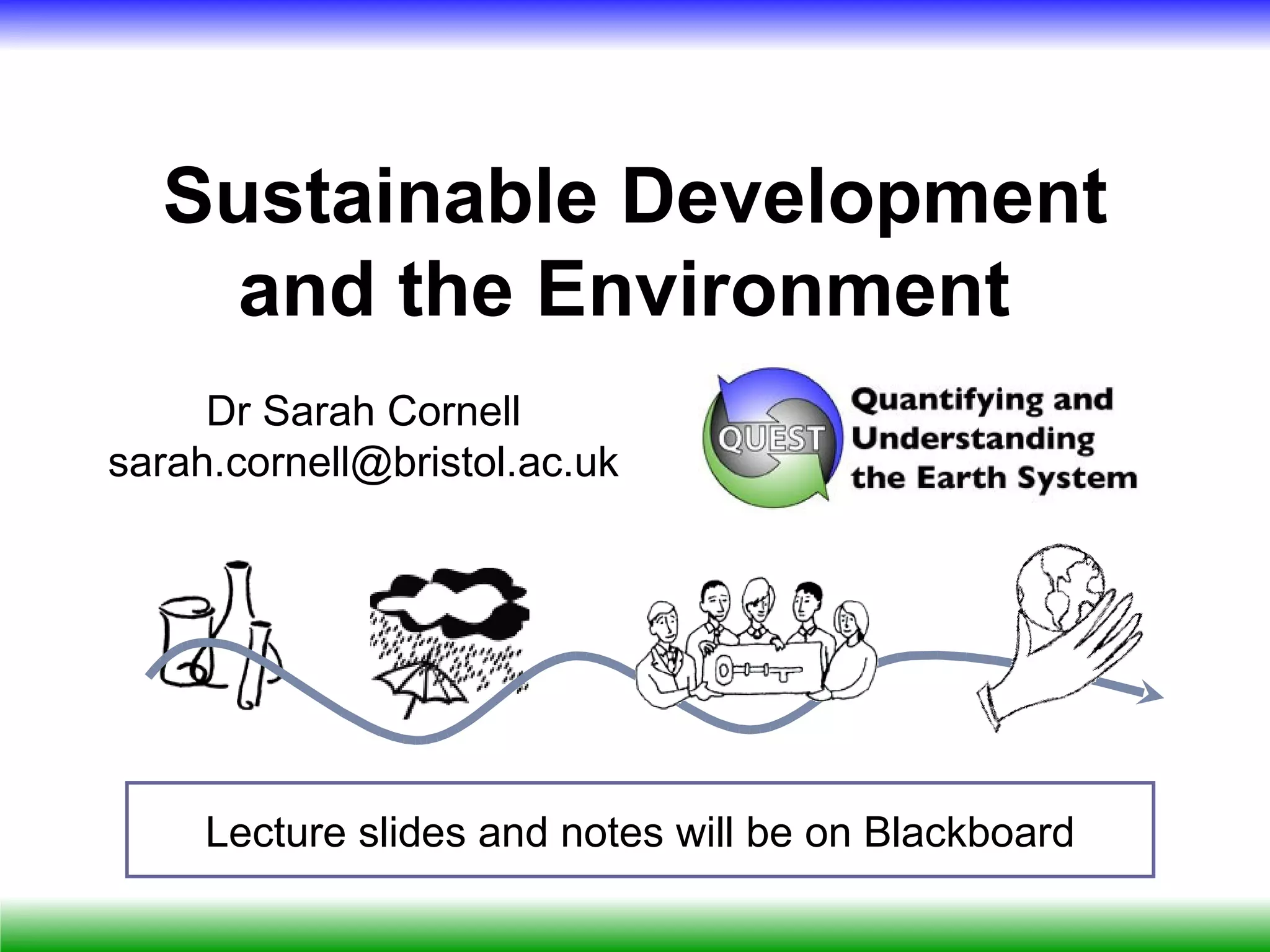 The document focuses on sustainable development and environmental change, emphasizing the earth system and socio-ecological systems. It discusses the pressures and impacts of human activities on the environment, including case studies on pollution and water quality, alongside legislative frameworks aimed at managing these issues. It also highlights the importance of understanding interactions within ecological systems and the need for integrated management strategies to promote sustainability.