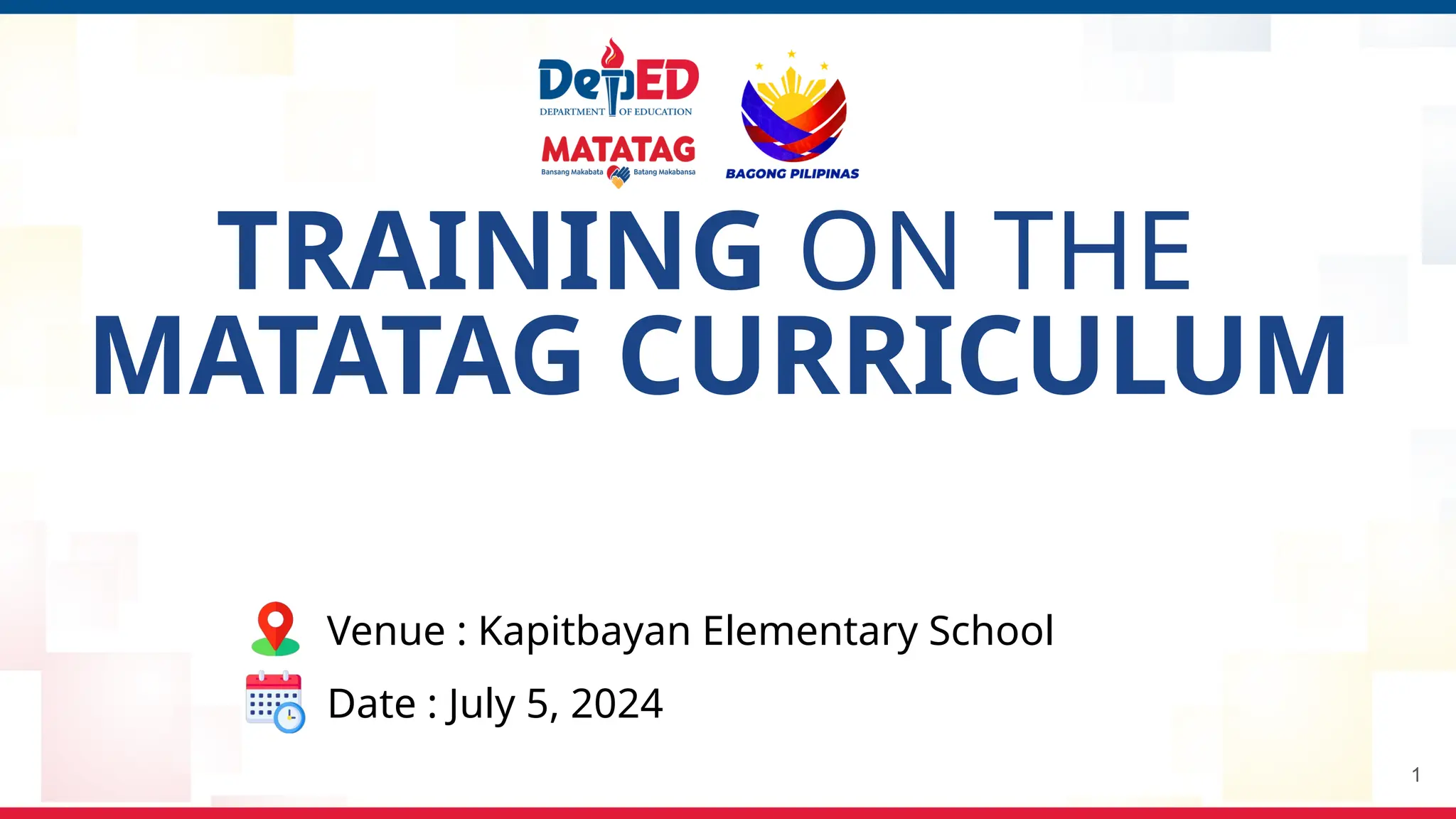 The document outlines a training session on the Matatag Curriculum conducted at Kapitbayan Elementary School on July 5, 2024, focusing on improving professional development programs for teachers and school leaders. It emphasizes the importance of a whole-school approach to curriculum planning, effective communication, and the continuous professional growth of school personnel to enhance student learning outcomes. Key elements of successful implementation include leadership support, collaborative planning, and the use of high-quality instructional materials.