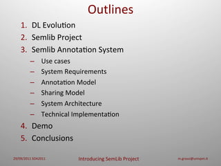 The document introduces the SemLib project, which aims to develop semantic web tools for digital libraries. Specifically, it will develop a semantic annotation system and recommender system. The semantic annotation system will allow users to generate and share structured annotations on digital objects in a way that is published as linked data. This supports engagement of both expert and non-expert users in enriching digital library collections. The document outlines the project details, expected outputs, use cases, system requirements, and proposed annotation and sharing models.