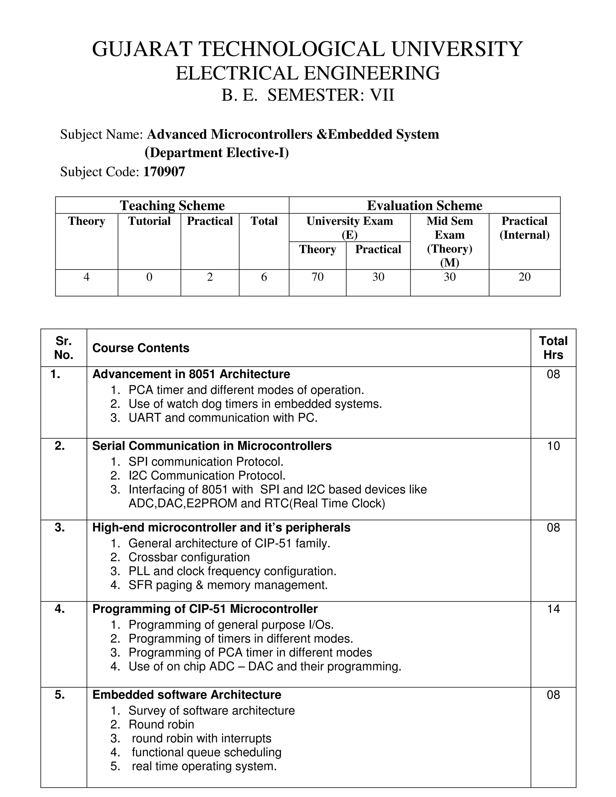 This document outlines the course contents and structure for an Advanced Microcontrollers & Embedded Systems course. The course covers topics like advancement in 8051 architecture including timers and communication, serial communication protocols like SPI and I2C, high-end microcontrollers and peripherals like CIP-51 architecture, and programming and software architecture including real-time operating systems. The course involves both theory and practical sessions, with evaluation based on a mid-semester exam, practical internal exam, and university exam. Suggested experiments involve programming timers, UART, SPI, I2C, and on-chip peripherals on microcontrollers. Reference books on microcontroller architecture, interfacing, programming, and embedded software design are also listed.