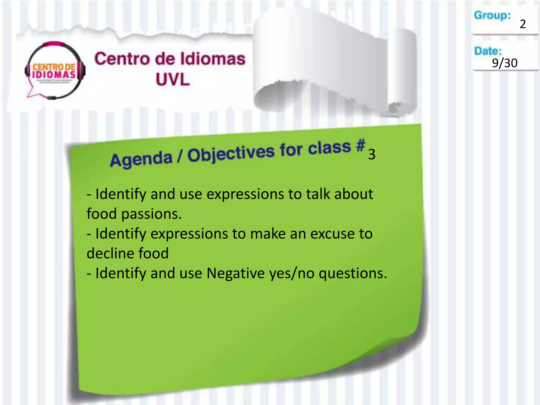This document contains notes from an English lesson that covered expressing food passions, making excuses to decline food, and asking negative yes/no questions. The lesson defined a yes/no question as one that can be answered with yes or no and explained that the structure includes an auxiliary verb followed by the subject and main verb with a question mark. It also defined negative yes/no questions as having the same structure but with "not" placed between the auxiliary and main verbs.