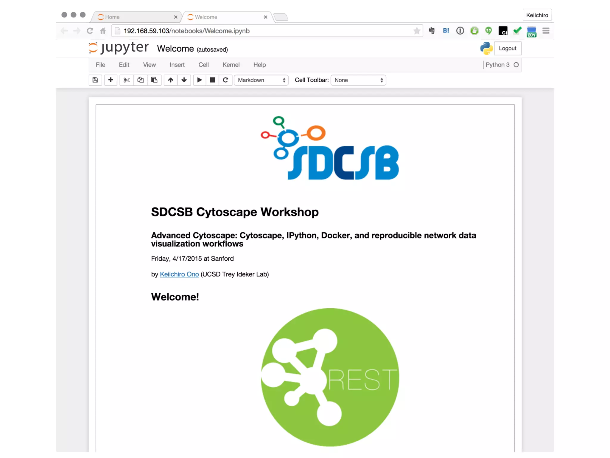 This document provides an overview of a tutorial on building reproducible network data visualization workflows using Cytoscape and IPython Notebook. The tutorial will cover integrating data, analyzing networks, visualizing results, and preparing outputs for publication. It will demonstrate setting up a portable data analysis environment using Docker and sharing work through GitHub. The bulk of the tutorial will focus on using IPython Notebook as an electronic lab notebook for interactive and reproducible experiments with Cytoscape.