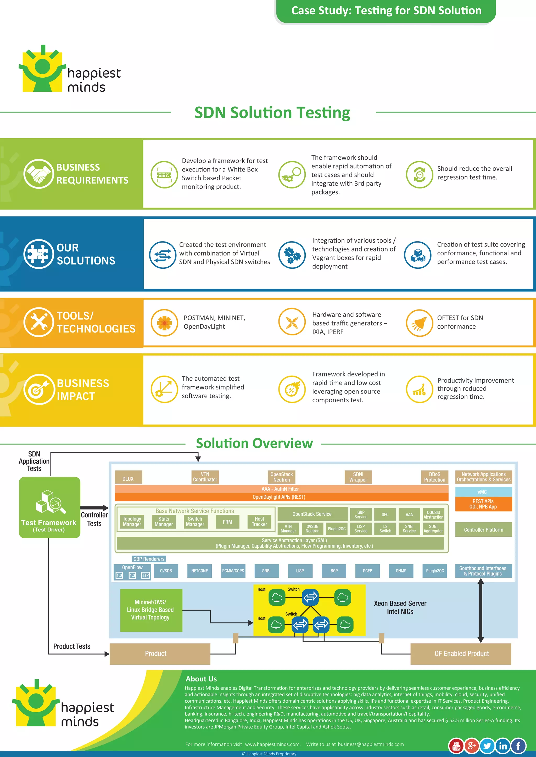The document presents a case study on developing a testing framework for a white box switch-based packet monitoring product, integrating virtual and physical SDN switches along with various tools to automate testing. The framework aims to reduce regression test time significantly while improving productivity through a comprehensive test suite. Happiest Minds, the company behind this solution, specializes in digital transformation across multiple industries and has received $52.5 million in Series A funding.