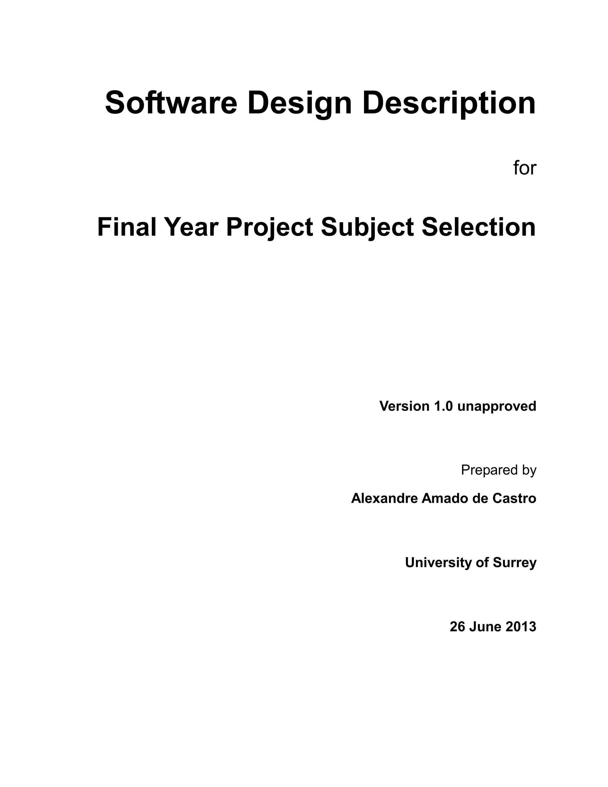 This document provides a software design description for a web application to help university students select keywords for their final year projects. The application architecture includes components for students to select keywords, administrators to manage keywords and student access, and a database to store information. The design aims to provide students with better information to make informed choices about their project topics.