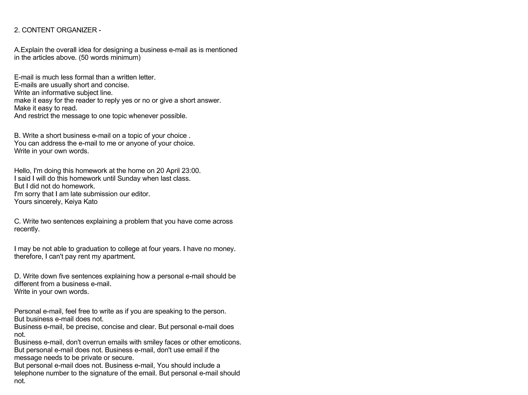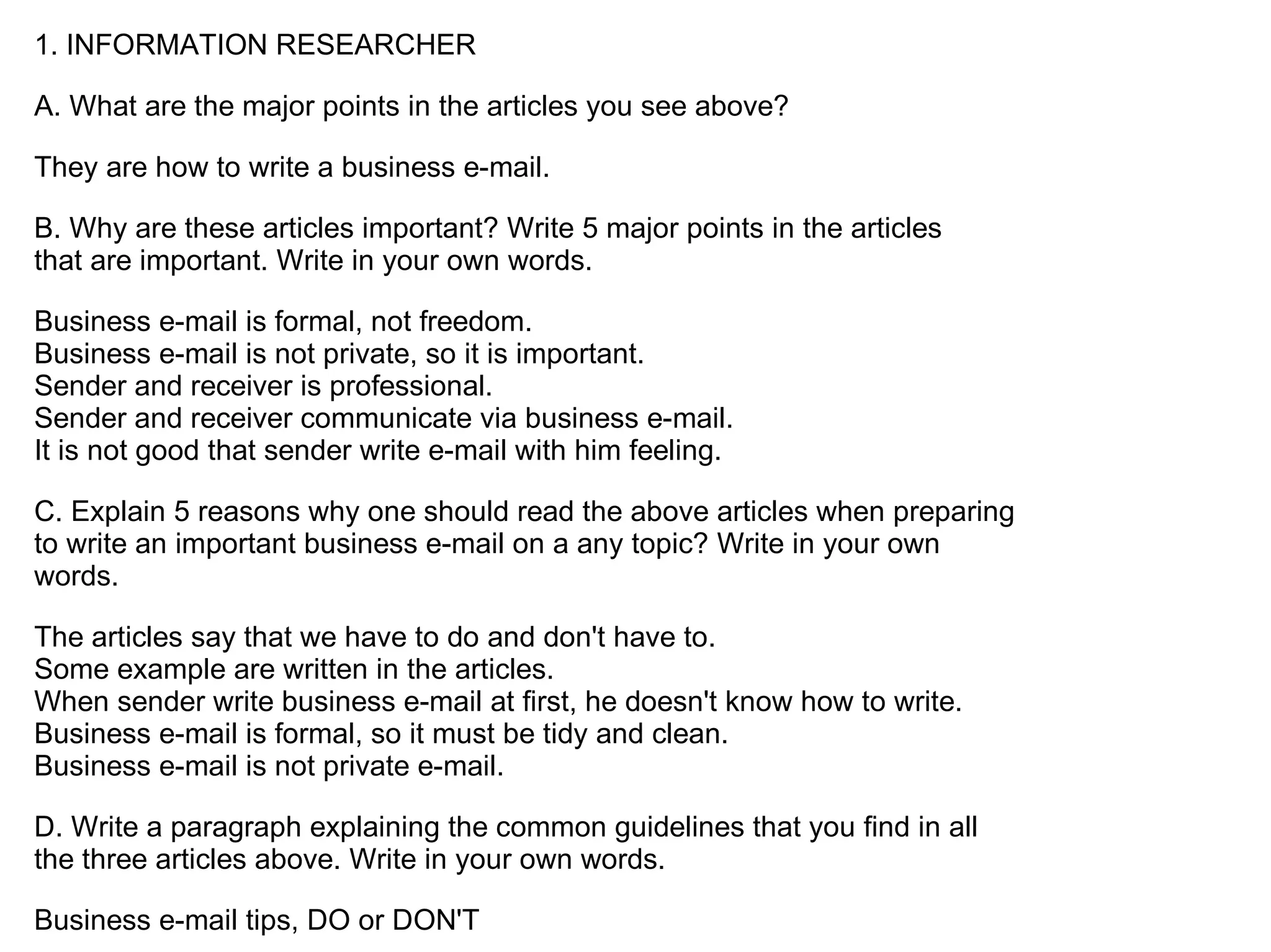 The document provides guidelines for writing effective business emails based on three reviewed articles. Business emails should be formal, concise, and focus on one topic. They are not private and should avoid personal feelings. Common tips include being polite, using a clear subject line, making the email easy to read and reply to, and restricting the message to a single topic. A sample business email is included that addresses homework being late. Personal emails can be more informal compared to business emails.