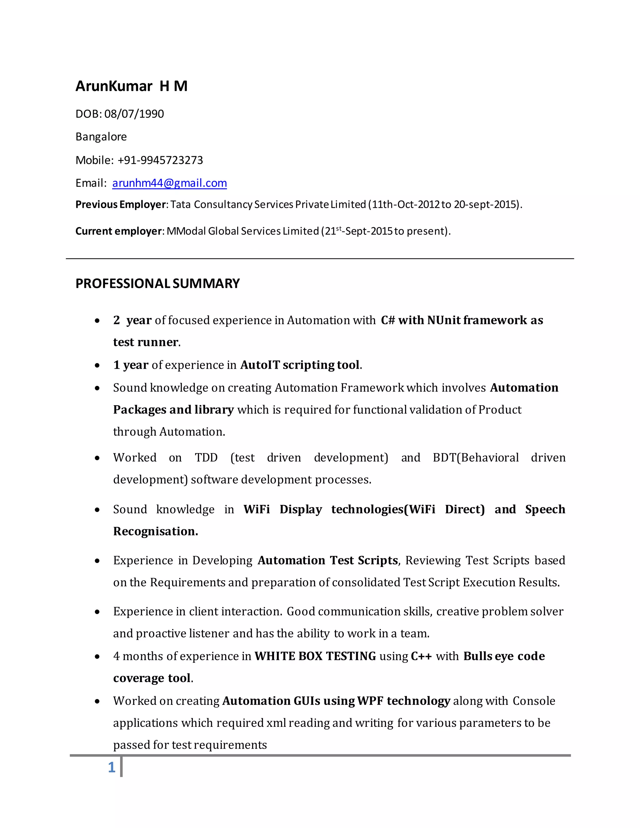 Arun Kumar is a software test automation engineer with over 5 years of experience developing automated test scripts using C# and AutoIT. He has worked on testing products in the wireless communications, healthcare and banking domains. His technical skills include C#, AutoIT, TDD, BDT, Agile, Waterfall methodologies and he has experience with tools like Visual Studio, SQL Server, and Tortoise HG.