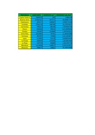 km2 DENSIDAD hab./km2 Capital federal 2960976 200 14804,88 Buenos Aires 12582321 307571 40,90867149 Catamarca 265571 100967 2,630275238 Cordoba 2764176 168766 16,37874927 Corrientes 795021 88199 7,979494746 Chaco 838303 99633 8,413909046 Chubut 356587 224686 1,587045922 Entre Rios 1022865 78781 12,98365088 Formosa 404367 72066 5,611064857 Jujuy 513992 53219 9,658054454 La Panpa 260034 143440 1,812841606 La Rioja 220729 89680 2,461295718 Mendoza 1414058 148827 9,501353921 Misiones 789677 29801 26,49833898