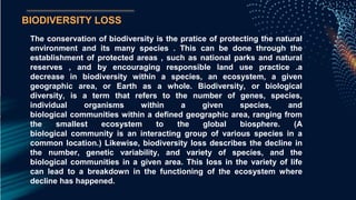 The document discusses biodiversity loss and ways to protect forests and biodiversity. It defines biodiversity as the variety of life on Earth, including genetic diversity, species diversity, and ecosystem diversity. Biodiversity loss refers to the decline in these aspects of life on our planet. The key drivers of biodiversity loss mentioned are deforestation, degradation and loss of natural habitats, and land degradation. The document emphasizes that protecting biodiversity through sustainable land use and preservation of ecosystems is critical to human survival, as we are all part of the same living system.