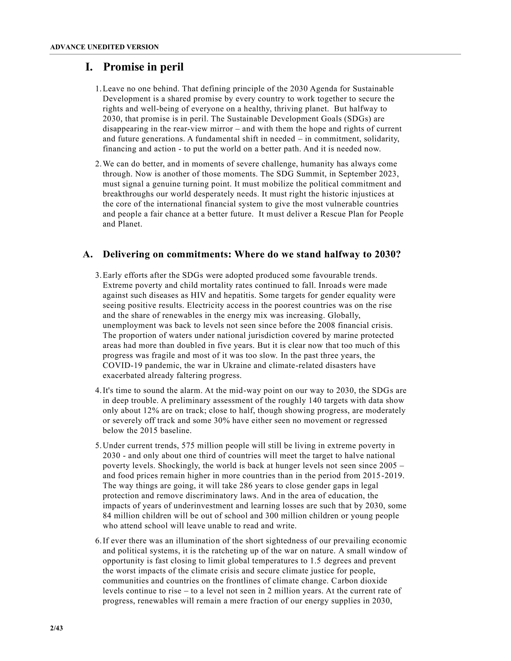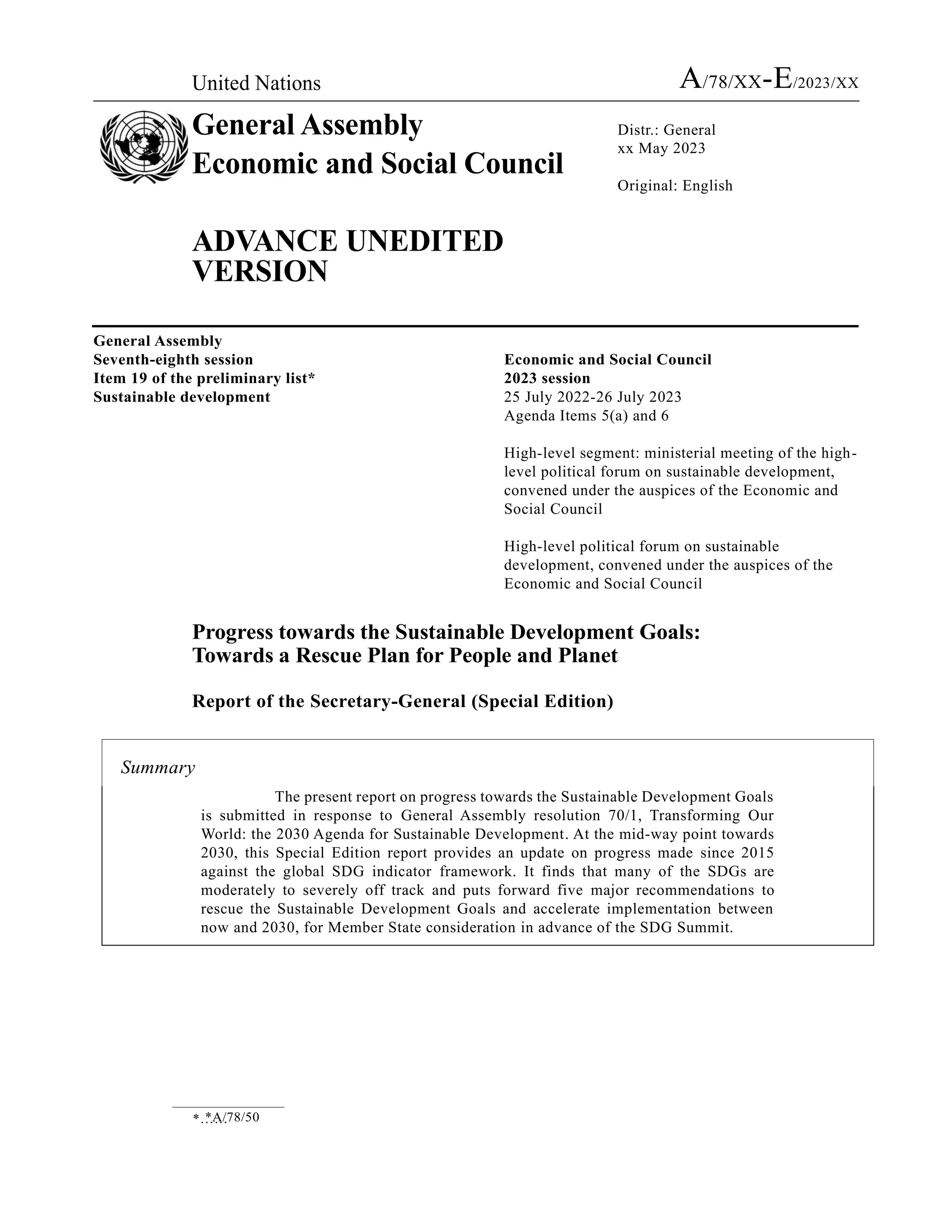 The report finds that progress towards achieving the UN Sustainable Development Goals is off track. At the midway point to 2030, many SDG targets are moderately to severely off track. The report calls for urgent action in five key areas to rescue the SDGs, including recommitting to accelerated action, advancing policies to reduce poverty and inequality, strengthening national capacity and accountability, mobilizing resources for developing countries, and strengthening the UN development system.