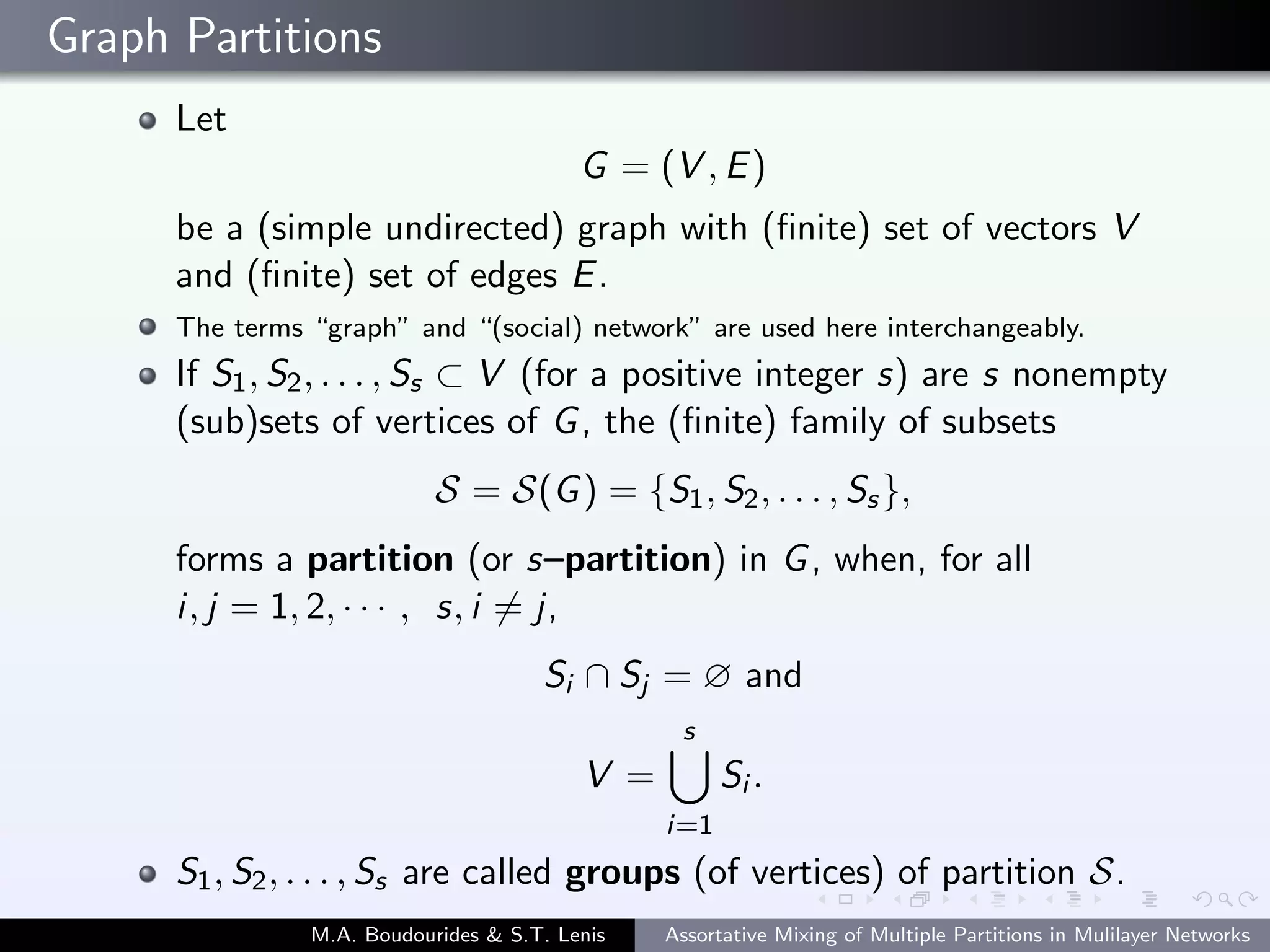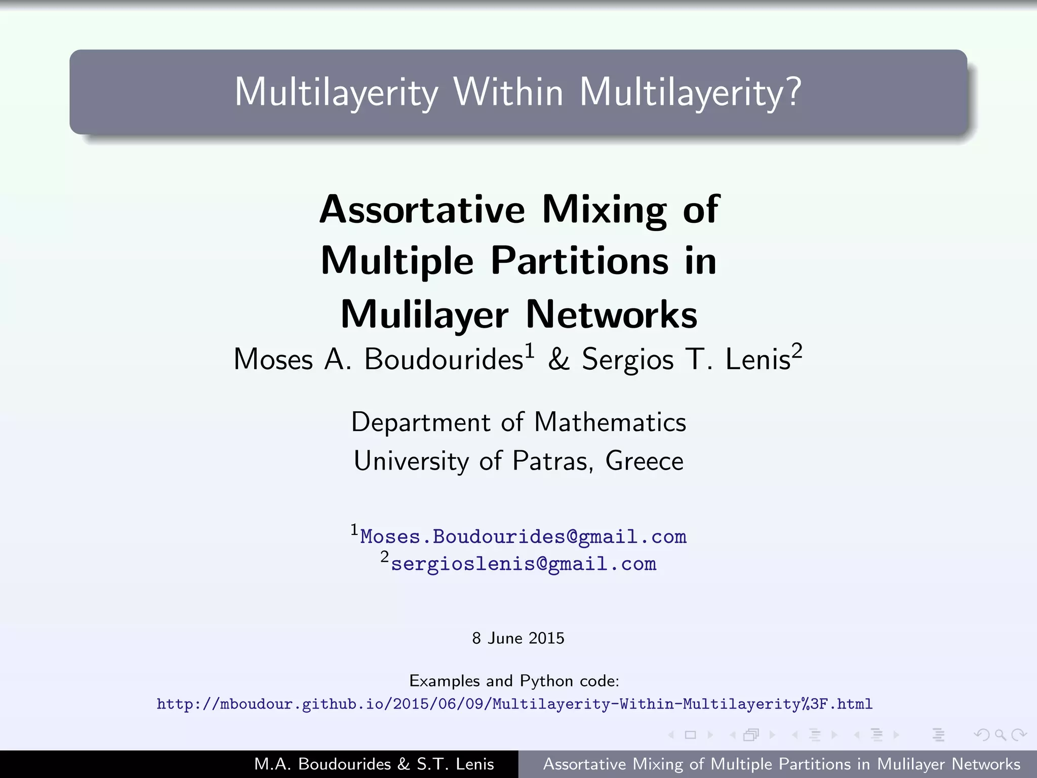 This document discusses assortative mixing and partitions in multilayer networks. It defines graph partitions, ordering of partitions, self-similarity of partitions, and how partitions can be viewed as enumerative attribute assignments. It then defines the assortativity coefficient of a partition to measure how strongly vertices in the same group of a partition are connected. Finally, it discusses how to measure assortativity between two different partitions of a graph by focusing on their intersection partition.