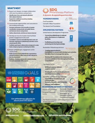 Philanthropy has become a key player in the global conversation about the post-2015 development agenda and the SDGs, with initiatives aimed at fostering collaboration between philanthropic organizations, UN agencies, governments, and civil society. In the past year, significant progress has been made, including the establishment of a data portal for philanthropic giving and pilot programs in several countries to facilitate engagement and coordination for SDG implementation. Future strategies will focus on strengthening partnerships, expanding awareness, and enhancing the capacity of local philanthropic organizations to support sustainable development efforts.
