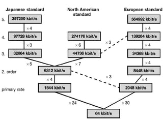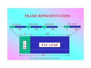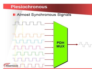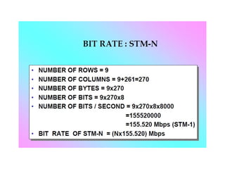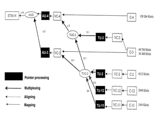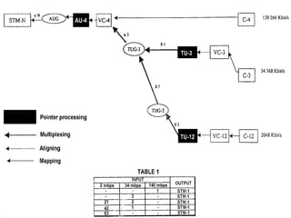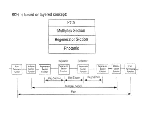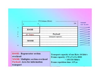 The document discusses Synchronous Digital Hierarchy (SDH) and its advantages over Plesiochronous Digital Hierarchy (PDH). It describes some key components of SDH including section overhead bytes, path overhead bytes, virtual containers, tributary units, and administrative units. It also provides definitions and functions of various overhead bytes used for frame alignment, error monitoring, data communication, and other purposes in SDH networks.