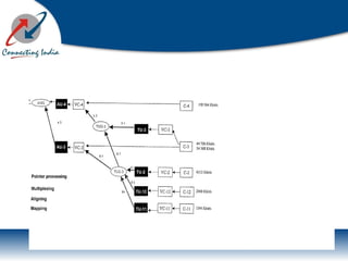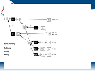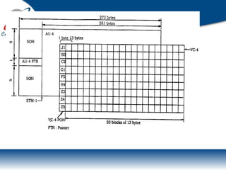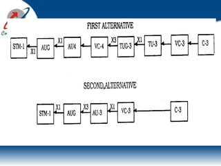 The document discusses the mapping and multiplexing of asynchronous 2048 kbps tributaries onto an STM-1 frame. It describes how the 2048 kbps signal is mapped into a VC-12 container by adding justification bytes and then into a TU-12. Multiple TU-12s carrying different tributaries are multiplexed into a TUG-2. Several TUG-2s are then multiplexed into a TUG-3, which is further multiplexed into a VC-4 container along with other TUG-3s. The VC-4 is then multiplexed with an AU-4 and pointers to form an STM-1 frame for transmission.