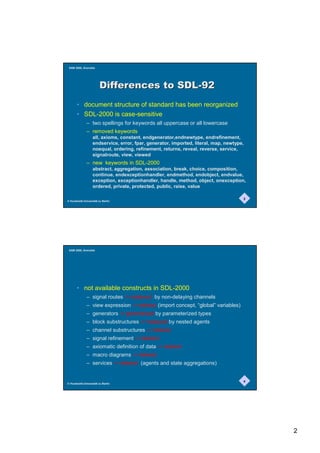 The document discusses differences between SDL-92 and SDL-2000. SDL-2000 has been revised with removal of outdated concepts, alignment of existing concepts, and introduction of new concepts. It is now completely object-oriented and has a new formal semantics. Agents are the basic specification concept in SDL-2000 and model active system components as extended finite state machines. Agents can be hierarchically decomposed into block and process agents with different scheduling semantics.