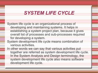 The document discusses the system development life cycle (SDLC), which includes various phases for developing and maintaining systems. The key phases are: system investigation, feasibility study, system analysis, system design, coding, testing, implementation, and maintenance. The feasibility study phase evaluates the technical, operational, economic, motivational, and schedule feasibility of a proposed system. The system analysis phase involves studying user requirements and the current system. System design then specifies how the new system will meet requirements through elements like data design, user interface design, and process design. This produces specifications for the system.