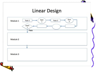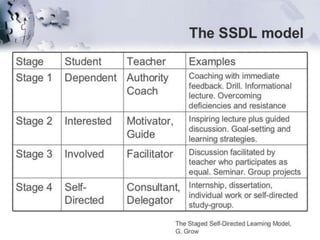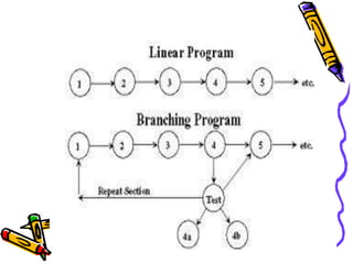This document provides an overview of programmed instruction, self-directed learning (SDL), computer-assisted instruction (CAI), and e-learning. It defines each topic and discusses their characteristics, principles, types, advantages and limitations. Programmed instruction breaks content into small steps and provides feedback, while SDL emphasizes learner ownership and self-management. CAI uses computers to deliver instruction through various modes like tutorials and simulations. E-learning utilizes online resources and internet connectivity for distance learning.